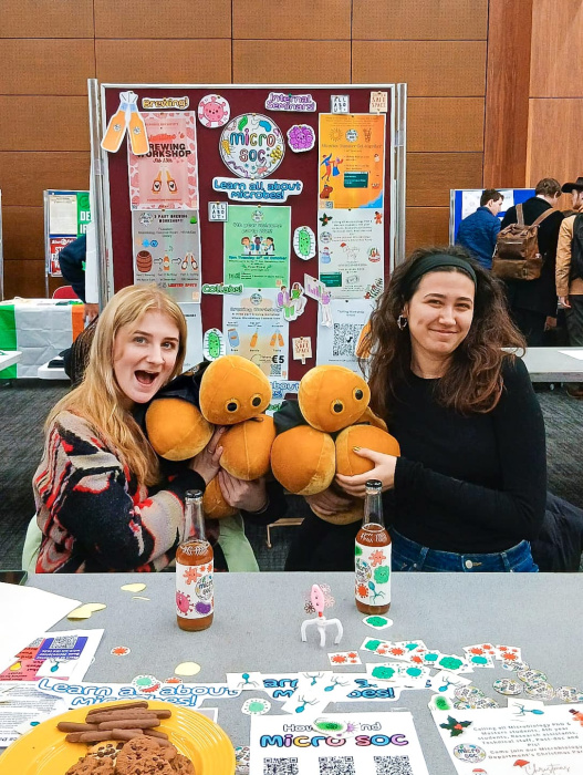 Photo of two Micro Soc committee members at the January 2026 socs day, showing off what our society is all about, of course featuring some Giant Microbes!