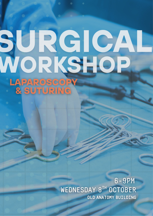 When? 6-9pm 8th of October Where? Old Anatomy Building Learn surgical skills inclusive of hand tie knots, sutures and laparoscopy with snacks included! Tickets available via society email, limited spaces.