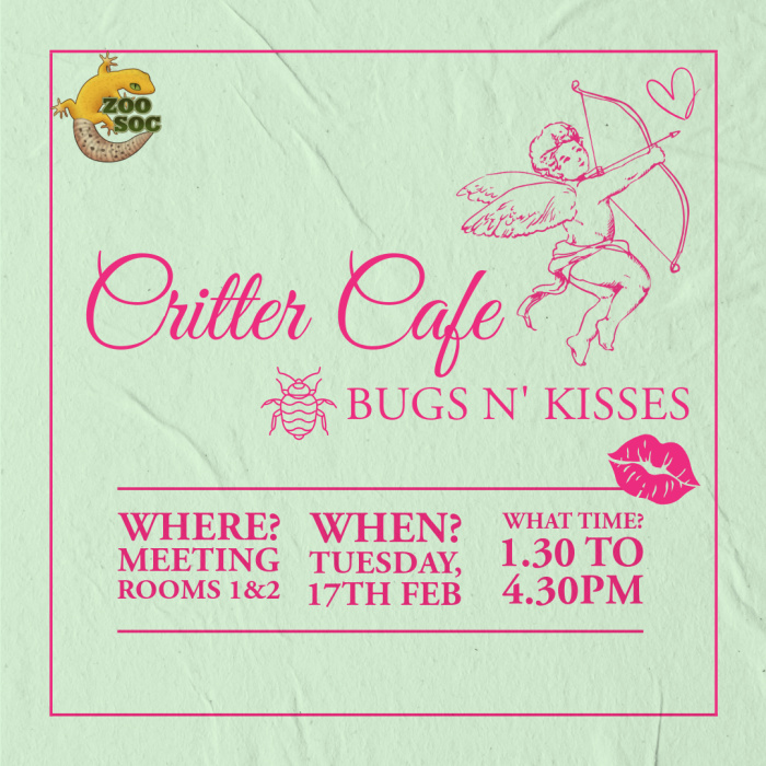 Do you like animals? Do you like learning and talking about animals?? Do you like getting to meet some cute animals??? Well this is the society for you!! Join ZooSoc today to gain access to weekly fun animal facts, as well as our variety of events including documentary screenings, educational and conservation talks, animal handling events (including our Critter Cafes, where you can meet some of the cool invertebrates, reptiles and amphibians), and much more!